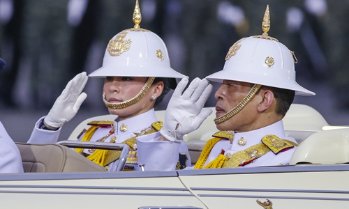 Queen Suthida Bajrasudhabimalalakshana and Princess Bajrakitiyabha accompanied the king to review the military parade, primarily designed to display their allegiances to the monarch and Royal Household.