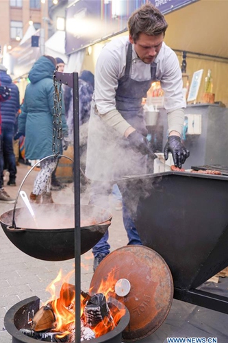 A man prepares food during the Riga Street Food Festival in Riga, Latvia, on Jan. 18, 2020. The Riga Street Food Festival kicked off here on Saturday. Bonfires and food stalls were set at the corner of Kalku and Valnu Streets in Old Riga for people to enjoy the city's popular dishes. Photo:Xinhua