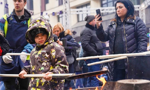 A boy cooks some food during the Riga Street Food Festival in Riga, Latvia, on Jan. 18, 2020. The Riga Street Food Festival kicked off here on Saturday. Bonfires and food stalls were set at the corner of Kalku and Valnu Streets in Old Riga for people to enjoy the city's popular dishes. Photo:Xinhua