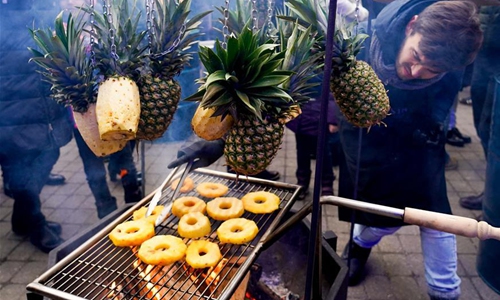 A man grills slices of a pineapple during the Riga Street Food Festival in Riga, Latvia, on Jan. 18, 2020. The Riga Street Food Festival kicked off here on Saturday. Bonfires and food stalls were set at the corner of Kalku and Valnu Streets in Old Riga for people to enjoy the city's popular dishes. Photo:Xinhua