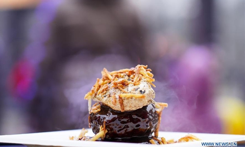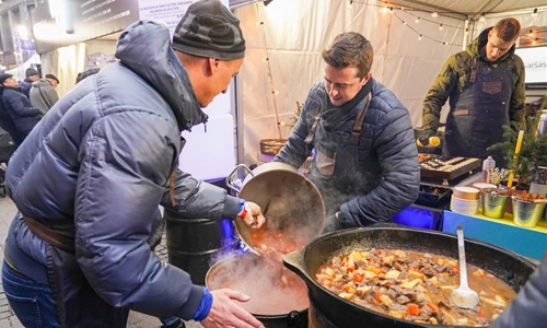 Venders prepare food during the Riga Street Food Festival in Riga, Latvia, on Jan. 18, 2020. The Riga Street Food Festival kicked off here on Saturday. Bonfires and food stalls were set at the corner of Kalku and Valnu Streets in Old Riga for people to enjoy the city's popular dishes. Photo:Xinhua