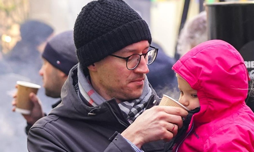 A man gives drink to his daughter during the Riga Street Food Festival in Riga, Latvia, on Jan. 18, 2020. The Riga Street Food Festival kicked off here on Saturday. Bonfires and food stalls were set at the corner of Kalku and Valnu Streets in Old Riga for people to enjoy the city's popular dishes. Photo:Xinhua
