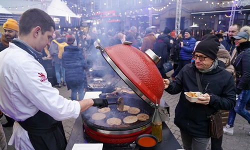 A vender cooks burgers during the Riga Street Food Festival in Riga, Latvia, on Jan. 18, 2020. The Riga Street Food Festival kicked off here on Saturday. Bonfires and food stalls were set at the corner of Kalku and Valnu Streets in Old Riga for people to enjoy the city's popular dishes. Photo:Xinhua