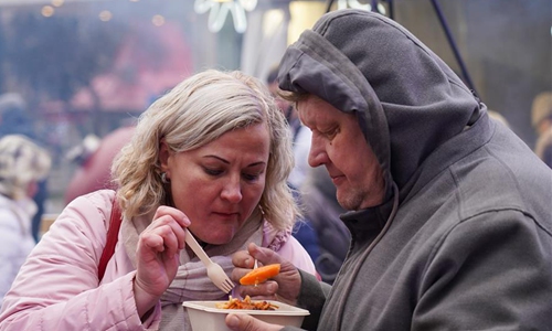 A couple enjoys food during the Riga Street Food Festival in Riga, Latvia, on Jan. 18, 2020. The Riga Street Food Festival kicked off here on Saturday. Bonfires and food stalls were set at the corner of Kalku and Valnu Streets in Old Riga for people to enjoy the city's popular dishes. Photo:Xinhua