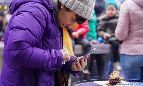A woman takes a photo of her food during the Riga Street Food Festival in Riga, Latvia, on Jan. 18, 2020. The Riga Street Food Festival kicked off here on Saturday. Bonfires and food stalls were set at the corner of Kalku and Valnu Streets in Old Riga for people to enjoy the city's popular dishes. Photo:Xinhua