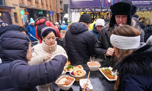 People enjoy food during the Riga Street Food Festival in Riga, Latvia, on Jan. 18, 2020. The Riga Street Food Festival kicked off here on Saturday. Bonfires and food stalls were set at the corner of Kalku and Valnu Streets in Old Riga for people to enjoy the city's popular dishes. Photo:Xinhua