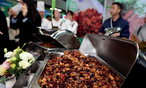 Photo taken on Dec. 15, 2019 shows the chicken cooked with chilies displayed by the canteen of Shanghai International Studies University during the Shanghai University Gourmet Carnival in Shanghai, east China. The second Shanghai University Gourmet Carnival kicked off in East China University of Science and Technology on Sunday, displaying more than 70 dishes from 34 colleges and universities in Shanhai. (Xinhua/Liu Ying)