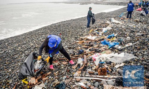 Volunteers clean up plastic waste on a beach in Lima, during the World Environment Day on June 5, 2018. The UN urged to take steps against the use of plastic bags, as part of a global challenge to reduce the increasing pollution of the oceans. Photo: Xinhua