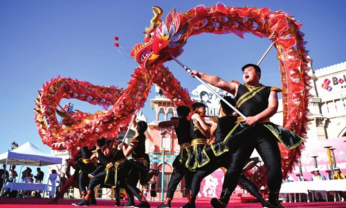 Dragon and lion dance teams celebrate the upcoming Spring Festival with a competition in Dubai, the United Arab Emirates, on Saturday. Seven teams from Beijing, East China’s Jiangsu Province and South China’s Guangdong Province, participated the event. File photo: cnsphoto