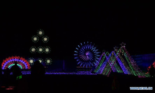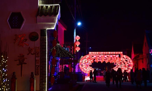Photo taken on Jan. 19, 2020 shows light decorations in Zhong'erzhang Village in Hebi City, central China's Henan Province. The village has taken measures to boost its nighttime economy, including updating landscape lighting and holding nighttime performance. (Xinhua/Feng Dapeng)