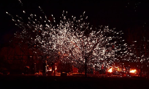 Molten iron is sprayed to simulate the display of fireworks in Zhong'erzhang Village in Hebi City, central China's Henan Province, Jan. 19, 2020. The village has taken measures to boost its nighttime economy, including updating landscape lighting and holding nighttime performance. (Xinhua/Feng Dapeng)