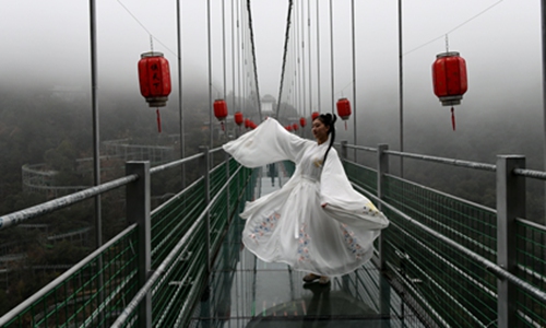 A visitor in a traditional Chinese dress dances on a glass bridge that is 300 meters long and 188 meters high, in Youxi county, East China's Fujian Province. Photo: cnsphoto