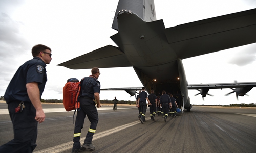 Firefighters board an Australian Defense Force (ADF) C-130 Hercules aircraft on Kangaroo Island on Thursday. The ADF transported firefighters from Adelaide to Kangaroo Island after bushfires ravaged the island off the south coast of Australia. Photo: AFP