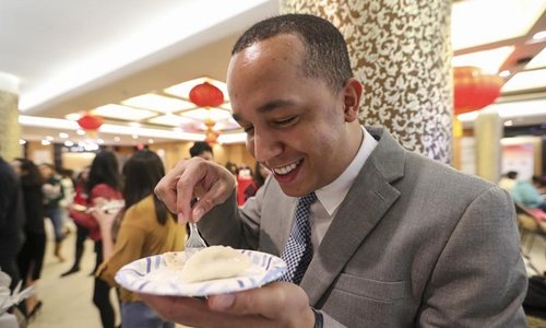 A student tastes dumplings during a New Year gala for Chinese and international youth in New York, the United States, Jan. 19, 2020. The great hall of the Chinese Consulate General in New York was filled with joyful laughter, beautiful melodies and the smell of dumplings on Sunday night. Some 200 Chinese, U.S. and other international college students gathered here for a Lunar New Year Gala to welcome the Year of the Rat. Photo:Xinhua
