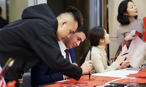 Students write Chinese calligraphy during a New Year gala for Chinese and international youth in New York, the United States, Jan. 19, 2020. The great hall of the Chinese Consulate General in New York was filled with joyful laughter, beautiful melodies and the smell of dumplings on Sunday night. Some 200 Chinese, U.S. and other international college students gathered here for a Lunar New Year Gala to welcome the Year of the Rat. Photo:Xinhua