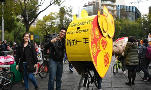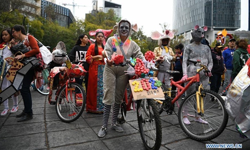 People participate in a bicycle zodiac decoration competition in Mexico City, Mexico, Jan. 19, 2020. Dozens of zodiac decorations works are shown during the competition, which offered Mexican people an access to the unique culture of Chinese New Year. Photo:Xinhua