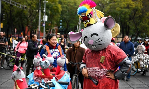 A man in costume of rat participates in a bicycle zodiac decoration competition in Mexico City, Mexico, Jan. 19, 2020. Dozens of zodiac decorations works are shown during the competition, which offered Mexican people an access to the unique culture of Chinese New Year. Photo:Xinhua