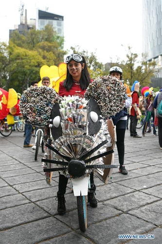 A woman participates in a bicycle zodiac decoration competition in Mexico City, Mexico, Jan. 19, 2020. Dozens of zodiac decorations works are shown during the competition, which offered Mexican people an access to the unique culture of Chinese New Year. Photo:Xinhua