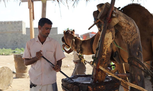 Photo taken on Jan. 19, 2020 shows sesame oil being pressed at an oil mill in Hajjah Province, Yemen. The business of extracting sesame oil in Yemen has been passed on for centuries and is considered a source of livelihood for many families in the country. Local people use a camel to power a small gristmill for oil extraction. Photo:Xinhua