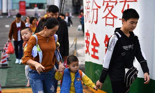 Passengers get on board a ferry at the Xiuying Port in Haikou, capital of south China's Hainan Province, Jan. 19, 2020. The Qiongzhou strait witnessed a travel rush peak as the Spring Festival is approaching. Photo:Xinhua