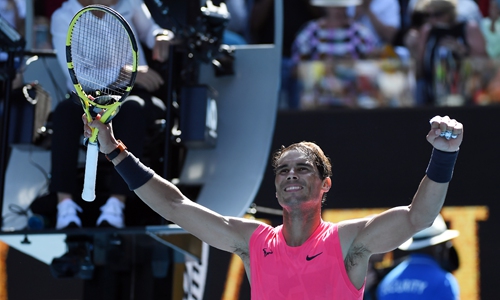 Rafael Nadal celebrates victory against Hugo Dellien at the Australian Open in Melbourne on Tuesday. Photo: AFP