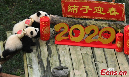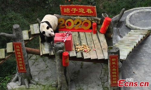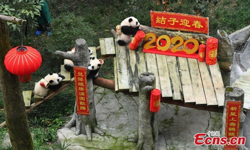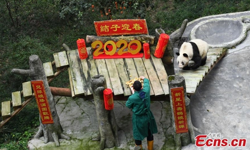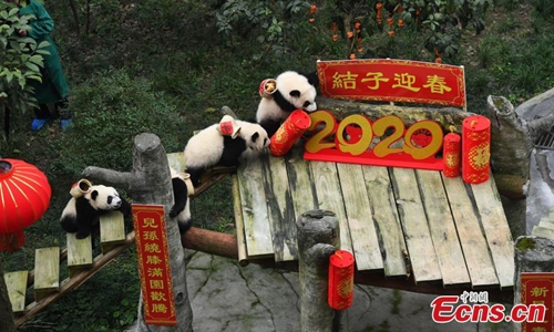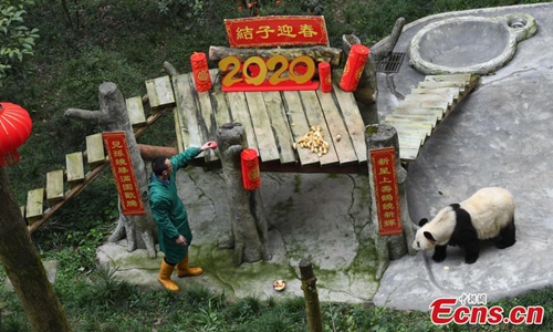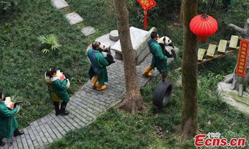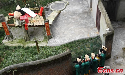 The world's oldest captive giant panda Xinxing and her four "great-grandchildren" celebrated the upcoming Spring Festival at a zoo in southwest China's Chongqing Municipality Tuesday. The 37-year-old celebrity "granny panda," her age equivalent to more than 100 human years, was treated with carrots, apples, bamboo shoots and leaves in the panda house decorated with lanterns and streamers. The food was carried to the dining area by the four panda cubs in baskets on their back as gifts for their "great-grandmother" to mark the occasion of their first meeting. (Photo: China News Service/ Chen Chao)