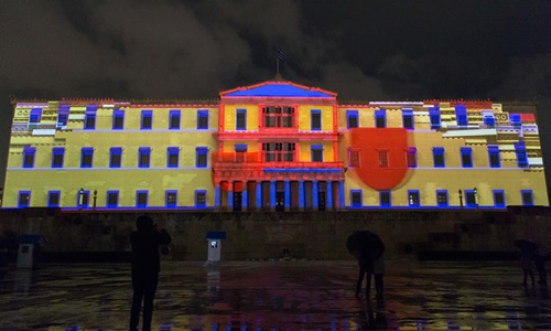 Photo taken on Dec. 10, 2019 shows the scene of 3D projection on the facade of the Greek Parliament during a tree lighting ceremony on Syntagma Square in Athens, Greece. (Xinhua/Marios Lolos)