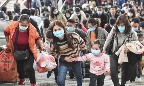 During the 2020 Spring Festival travel rush, many passengers wearing medical masks to protect themselves from the novel coronavirus leave a platform of the Guangzhou South Railway station, a railway hub of Guangzhou, South China's Guangdong Province, on Wednesday. Photo: cnsphoto