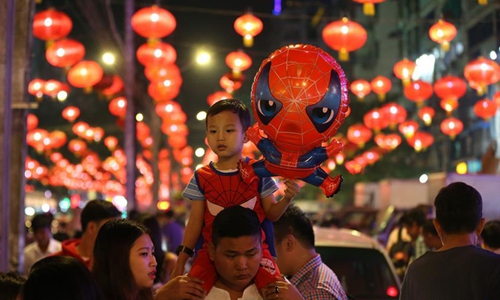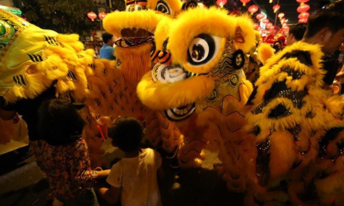 Lion dance performers interact with people during the celebration for the upcoming Chinese Lunar New Year in the Chinatown of Yangon, Myanmar, Jan. 22, 2020. The Chinese Lunar New Year falls on Jan. 25 this year. (Xinhua/U Aung)