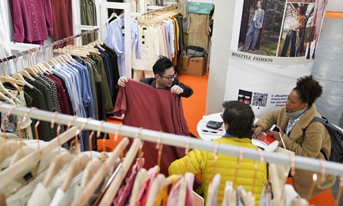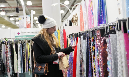A buyer looks at product samples during the 21th China Textile and Apparel Trade Show (New York) in New York, the United States, Jan. 21, 2020. (Xinhua/Wang Ying)