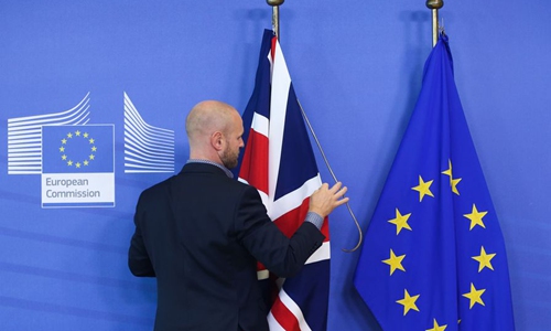A staff member arranges flags of the UK and the EU before a meeting between EU and British leaders at the European Commission headquarters in Brussels, Belgium, Oct. 17, 2019. (Xinhua/Zheng Huansong)