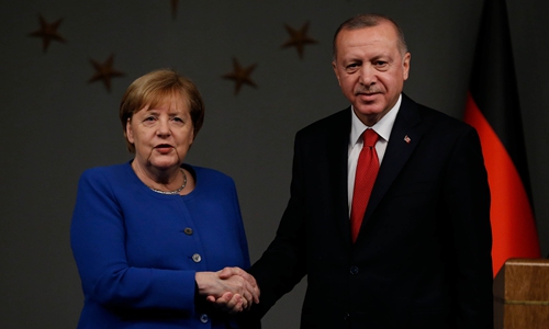 Germany's Chancellor Angela Merkel (L) shakes hands with Turkey's President Recep Tayyip Erdogan following their joint news conference in Istanbul, January 24, 2020. (Photos: CGTN)