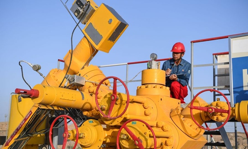 File photo shows a staff member works at Kela-2 gas field of the Tarim Oilfield in Aksu, northwest China's Xinjiang Uygur Autonomous Region. (Xinhua/Shen Hong)