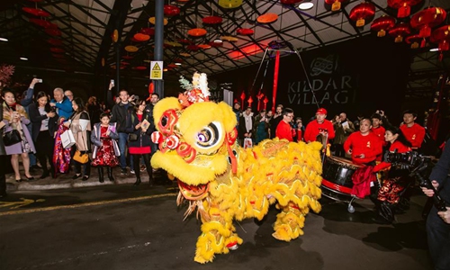 People watch a lion dance at the opening ceremony of Dublin Chinese New Year Festival in Dublin, Ireland, Jan. 23, 2020. Dublin Chinese New Year Festival, an annual event organized by Dublin City Council, opened here on Thursday night. (Xinhua)