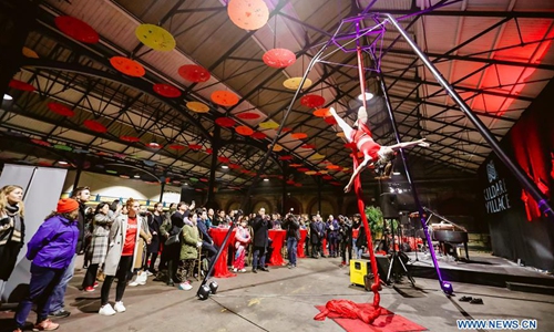 People watch an aerial dance at the opening ceremony of Dublin Chinese New Year Festival in Dublin, Ireland, Jan. 23, 2020. Dublin Chinese New Year Festival, an annual event organized by Dublin City Council, opened here on Thursday night. (Xinhua)