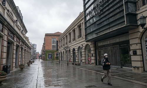 A man wearing a mask walks past a commercial area in Wuhan, central China's Hubei Province, on Jan. 26, 2020. Many residents here have reduced or avoided outdoor activities during the Spring Festival holiday in Wuhan, the hardest-hit city of the novel coronavirus outbreak in central China. (Xinhua/Xiong Qi)