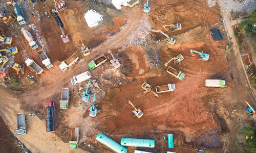 Aerial photo taken on Jan. 28, 2020 shows the construction site of Huoshenshan Hospital in Wuhan, central China's Hubei Province. The construction of Huoshenshan Hospital, a makeshift hospital for treating patients infected with the novel coronavirus, is underway in Wuhan. (Xinhua/Xiao Yijiu)