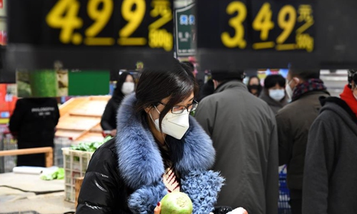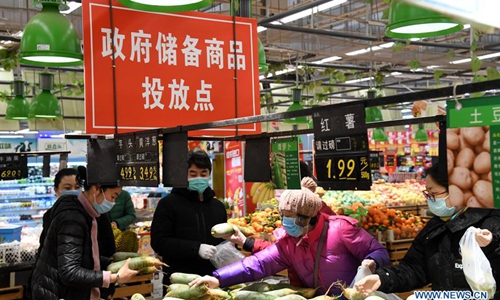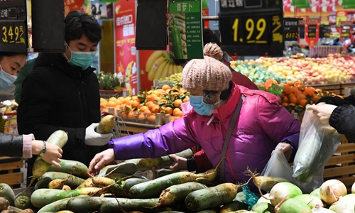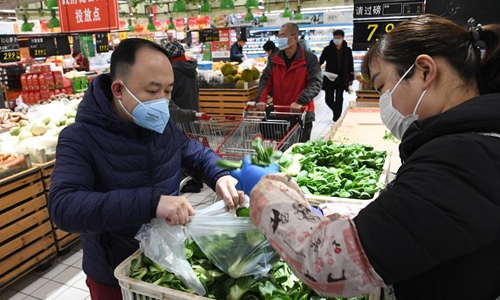 People buy vegetables in a supermarket in Qingdao, east China's Shandong Province, Jan. 29, 2020. To ensure the supply of vegetables during the fight against novel coronavirus in Qingdao, the local government has put vegetable reserves in the market. (Xinhua/Li Ziheng)