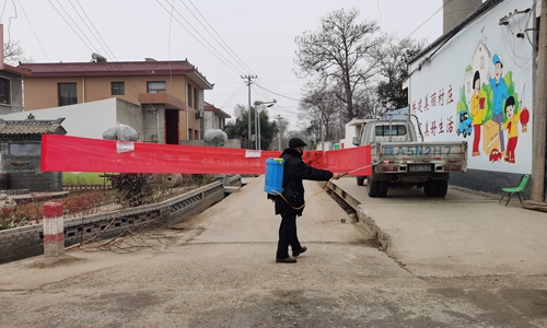 A Miaoxi village official from Northwest China's Shaanxi Province sprays disinfectants on the road and buildings. Photo: Li Lei/GT