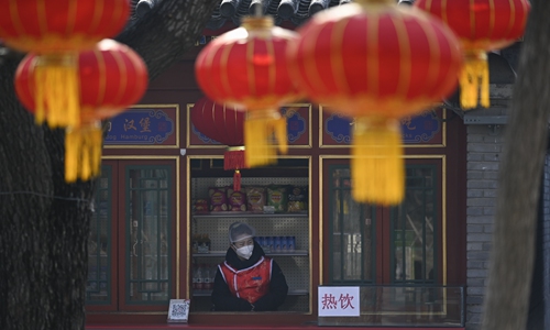 A staff member, wearing a facemask, waits for customers near the Forbidden City in Beijing on Friday. The Chinese people have just experienced an unforgettable Spring Festival as the whole country has been forced to endure the spread of the novel coronavirus.Photo: AFP