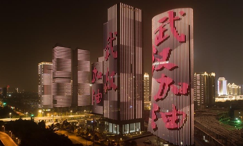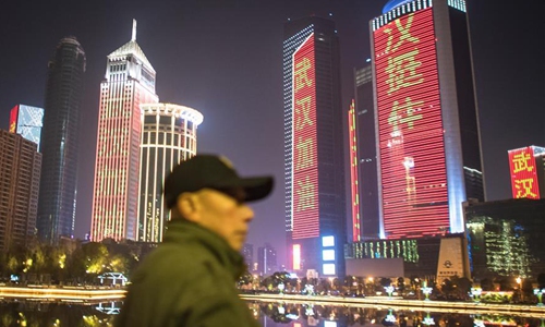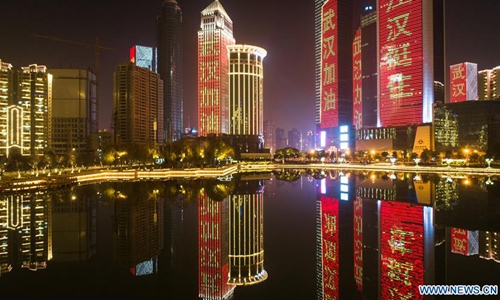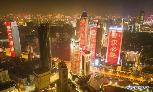 Aerial photo taken on Jan. 31, 2020 shows buildings illuminated with slogans to cheer the city on in Wuhan, central China's Hubei Province. (Xinhua/Xiao Yijiu)
