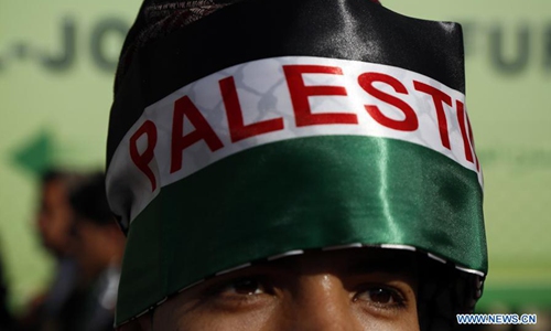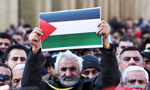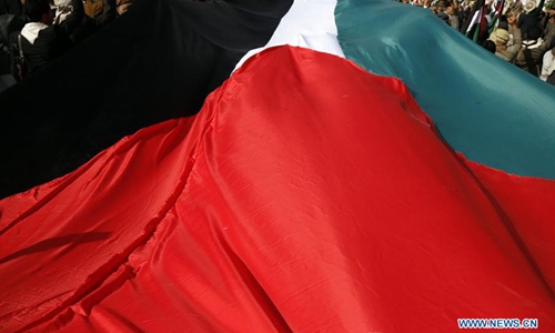 Yemeni protesters hold a Palestinian flag during a protest against the announced U.S. Middle East peace plan in Sanaa, Yemen, on Jan. 31, 2020. (Photo by Mohammed Mohammed/Xinhua)