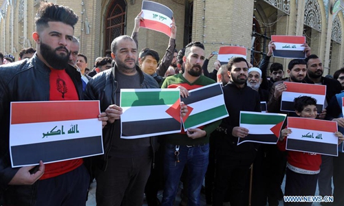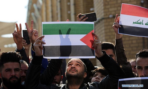 Iraqi people take part in a protest against the announced U.S. Middle East peace plan in Baghdad, Iraq, on Jan. 31, 2020. (Xinhua/Khalil Dawood)