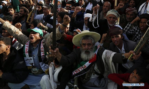 Yemeni people shout slogans during a protest against the announced U.S. Middle East peace plan in Sanaa, Yemen, on Jan. 31, 2020. (Photo by Mohammed Mohammed/Xinhua)