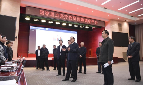 Chinese Premier Li Keqiang, also a member of the Standing Committee of the Political Bureau of the Communist Party of China (CPC) Central Committee and head of the leading group of the CPC Central Committee on the prevention and control of the novel coronavirus outbreak, inspects a national coordination center of key medical supplies for epidemic prevention and control in Beijing, capital of China, Feb. 1, 2020. (Xinhua/Zhang Ling)