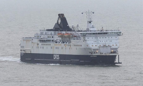 A ferry crosses the Dover Strait heading for the Port of Dover on the first day after Brexit in Dover, Britain, Feb. 1, 2020. Britain officially left the European Union (EU) at 11 p.m. (2300 GMT) Friday, putting an end to its 47-year-long membership of the world's largest trading bloc. (Photo by Ray Tang/Xinhua)