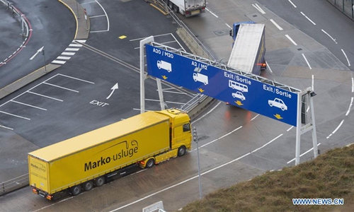 Trucks and cars leave the Port of Dover after crossing the Dover Strait on the first day after Brexit in Dover, Britain, Feb. 1, 2020. Britain officially left the European Union (EU) at 11 p.m. (2300 GMT) Friday, putting an end to its 47-year-long membership of the world's largest trading bloc. (Photo by Ray Tang/Xinhua)