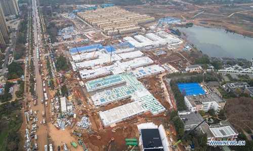 Aerial photo taken on Feb. 1, 2020 shows the construction site of Huoshenshan (Fire God Mountain) Hospital in Wuhan, central China's Hubei Province. According to the plan, the construction of the hospital will be completed on Feb. 2. (Xinhua/Xiao Yijiu)