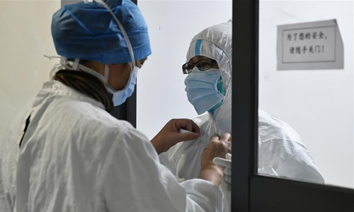 A medical worker helps a doctor put on the protective suit before he enters an isolation ward at Fuzhou Pulmonary Hospital of Fujian in Fuzhou, southeast China's Fujian Province, Jan. 31, 2020. (Photo by Wang Yi/Xinhua)