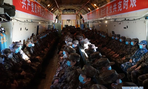 Military medical staff sitting in large transport plane of the air force of the People's Liberation Army (PLA) are on their way to Wuhan, central China's Hubei Province, Feb. 2, 2020. (Photo by Yuan Zhilong/Xinhua)